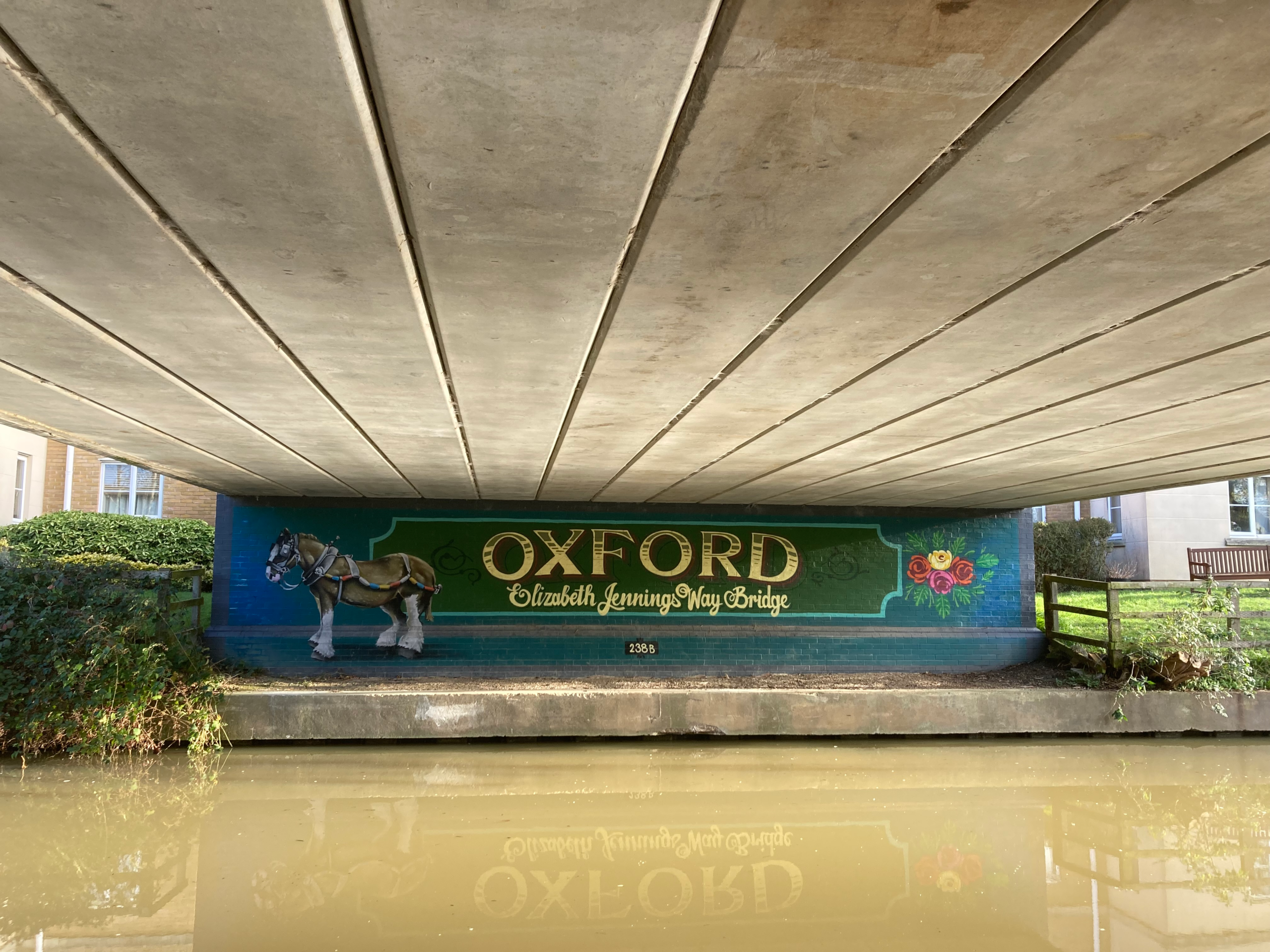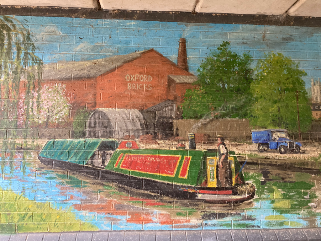 In order to deter graffiti, the Oxford Canal Mural Project commissioned Dan Wilson to paint interesting aspects of the local area under the arches of the bridge. Elizabeth Jennings has her name displayed on the narrowboat here, though she didn’t have any connection with the canal or the boat community as far as I am aware.